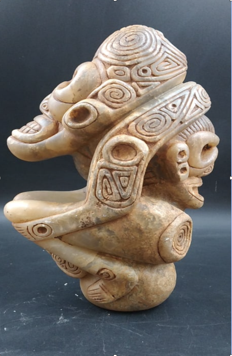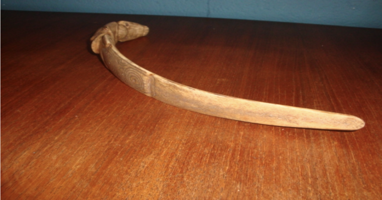 Le duho est un objet fascinant qui consiste en une large surface légèrement incurvée reposant sur quatre pieds. Le visage qui dépasse de l'extrémité antérieure présente à la fois des traits zoomorphes et anthropomorphes. Cette combinaison est typique de l'art Taino et est liée à leurs croyances religieuses. Selon les mythes de la création Taino, les animaux faisaient partie de leurs ancêtres les plus lointains et on pensait également que les âmes des morts pouvaient renaître sous forme animale. La surface plane est décorée de bandes légèrement incisées de motifs géométriques comprenant des cercles, des spirales et des lignes parallèles. Bien que difficiles à reconstituer aujourd'hui, ces symboles avaient sans aucun doute une certaine signification cosmologique pour les Taino.