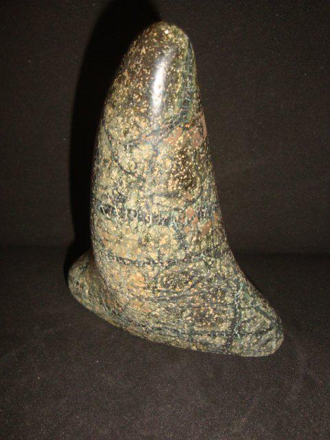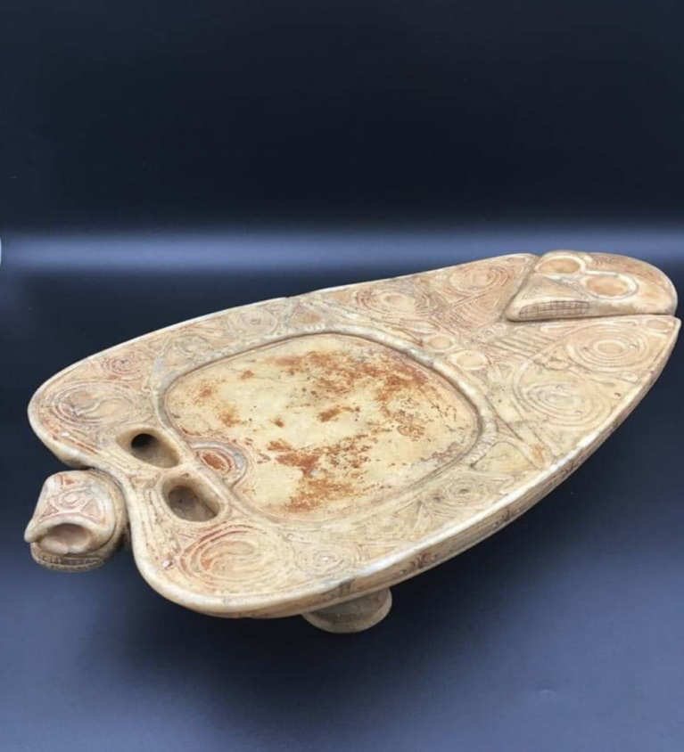 Il existe plusieurs possibilités quant à la fonction de cette pièce. La forme est étroitement liée à celle des sièges duho-taino qui étaient utilisés lors de cérémonies importantes, telles que les jeux de balle ou lors des rituels cohoba. Ceux-ci avaient souvent des dossiers hauts mais quelques exemples plats en pierre sont connus. La majorité des duhos ont été sculptés dans du bois et environ 100 exemplaires ont survécu. Leur production et leur distribution étaient contrôlées par les chefs taïnos (caciques) et seuls ceux du rang le plus élevé étaient autorisés à les utiliser. Compte tenu du temps et des efforts consacrés à la sculpture de cet exemple, il est peu probable qu'il ait été utilisé pour la préparation quotidienne des aliments. L'interprétation la plus convaincante est qu'il faisait partie de l'attirail élaboré, notamment des pilons, des amulettes et des sculptures zemi, utilisés lors des cérémonies du cohoba. On pensait que les chefs religieux taïnos, ou chamanes, étaient capables de communiquer avec les morts après être entrés dans un état de transe. Il s'agit d'un artefact Taino exceptionnel et rare qui plaira à tout collectionneur ambitieux d'art précolombien.